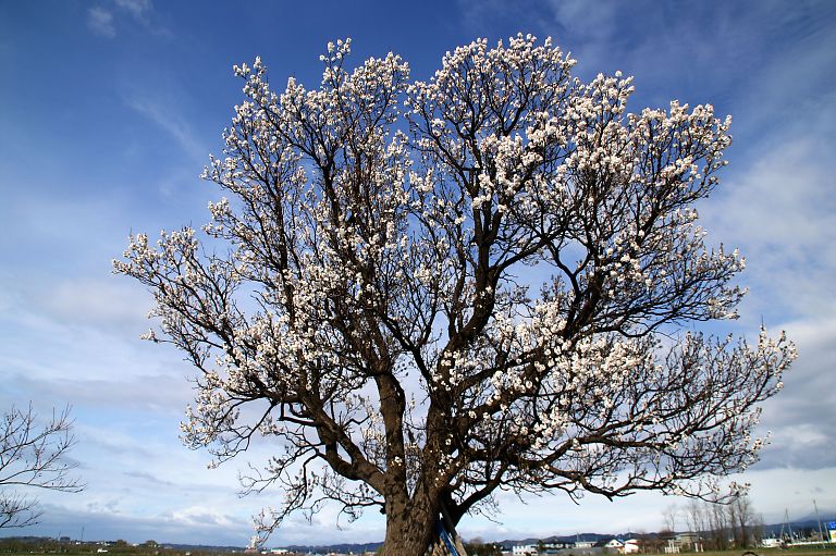 剪定されたことがないように伸びやかな枝ぶりの梅の木が満開です。白い花と黒い枝に空がよく似合います。