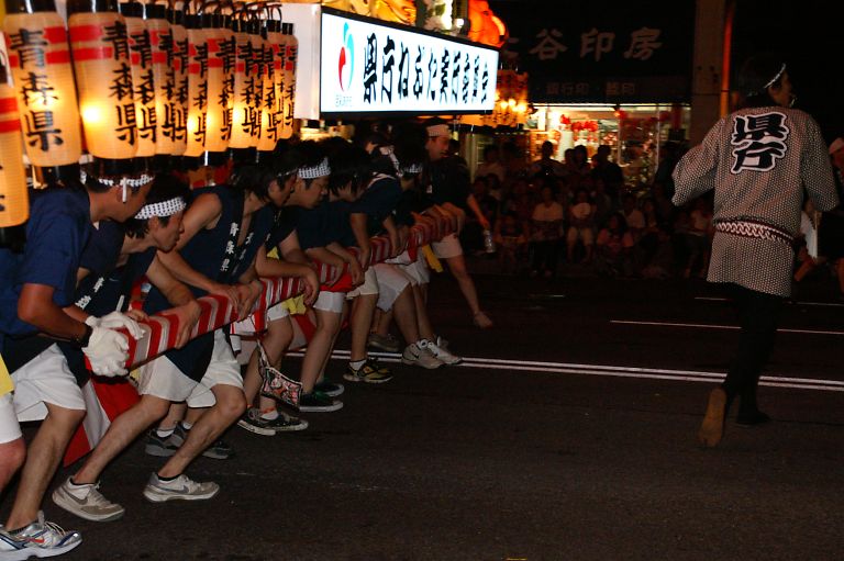 ねぶたを踊らせる縁の下の力持ち。ねぶたの前方。