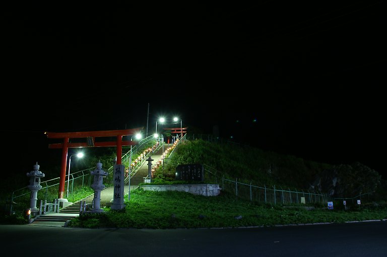 真夜中過ぎに行ってみた蕪島はライトアップ(?)されていました。灯籠と階段だけが浮かび上がって不思議な世界でした。