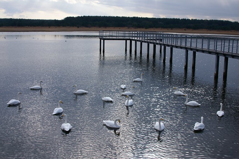 六ヶ所村の野鳥観察公園の桟橋のそばには人影を見ると白鳥が寄ってくる。
