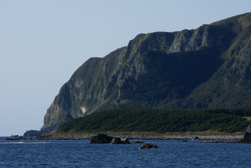 尻屋崎を東側に回り込むと虚空に岩山が現れる。桑畑山が太平洋に落ち込むクキドウノ崎。