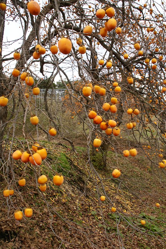 斜面に沿った枝先に実を結ぶ妙丹柿。