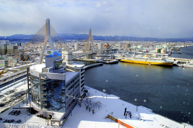 南西方向を俯瞰。ベイブリッジと八甲田丸。