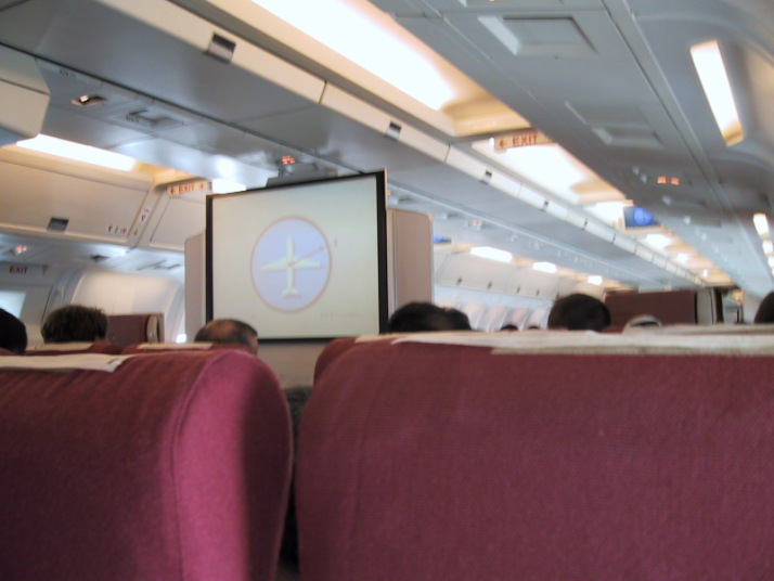 ロイヤル・ブルネイ航空の機内。スクリーンにはメッカの方向が示されているようです。