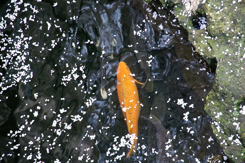 緋鯉と花びら。よく見ると真鯉もいます。