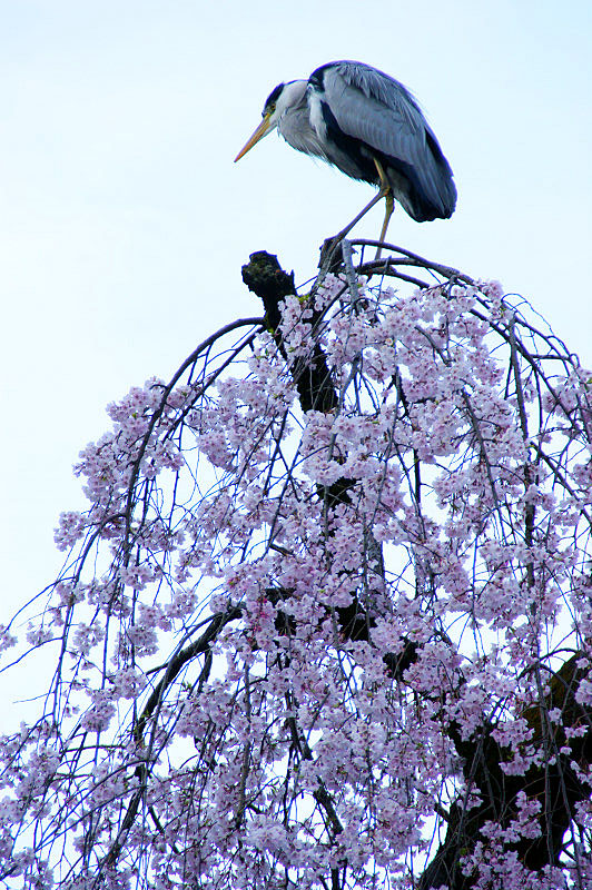 兼六園 瓢池の枝垂れ桜の上にいたアオサギ
