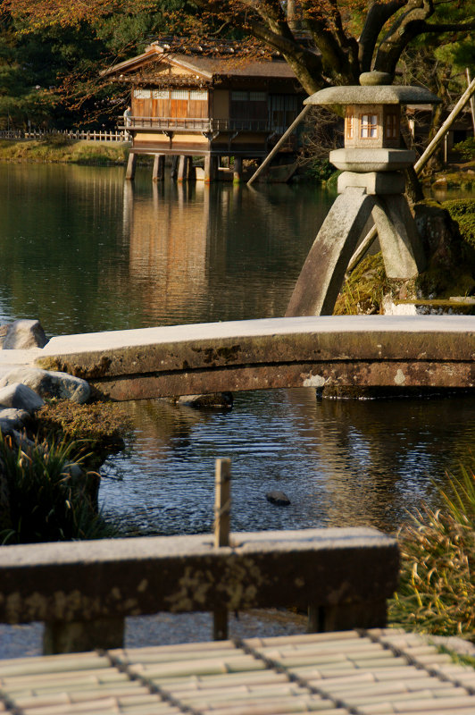 兼六園 徽軫灯籠、霞ヶ池に浮かぶ内橋亭