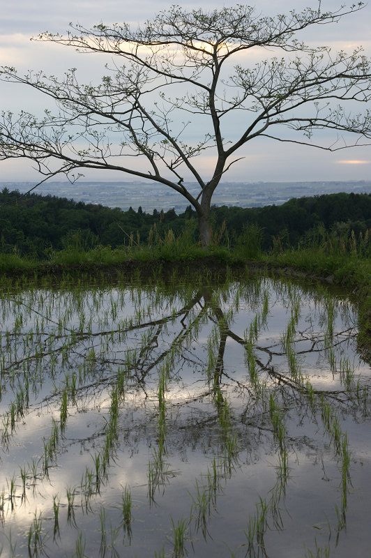田植えの済んだ棚田。彼方に手取川扇状地を俯瞰する。