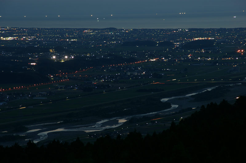 手前、手取川が左から右に流れている。遠方、日本海に漁り火が見える。