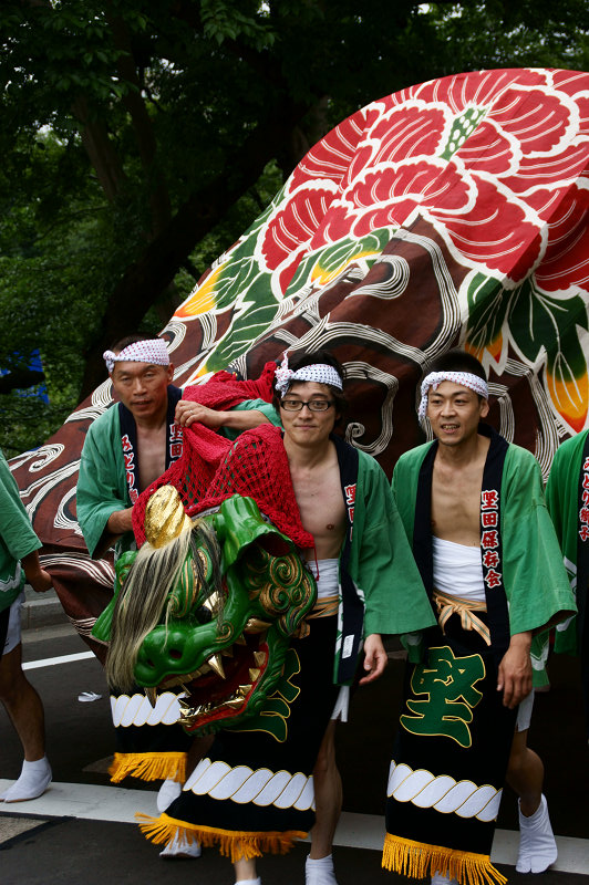 加賀獅子:獅子頭。三味線、笛、太鼓の囃子方は大きな胴体(蚊帳)に入っている。