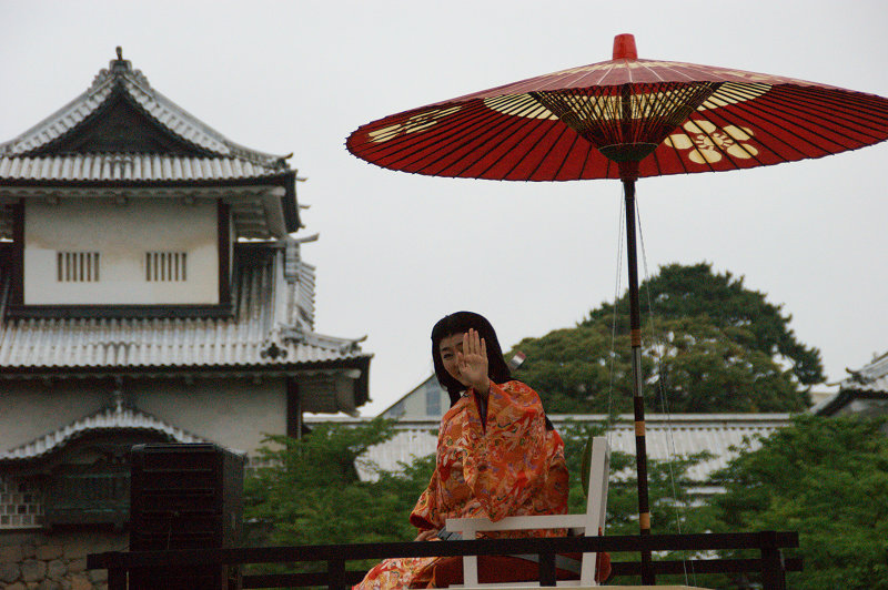 お松の方(熊谷真美さん)は石川橋のたもとで下車して歩いて入城していった。