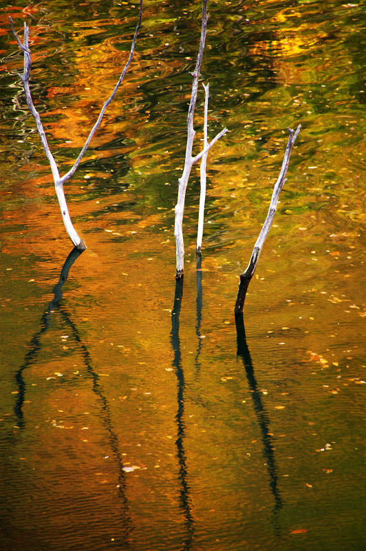 九頭竜湖にて   紅葉を映す水面に立つ白骨木